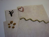 I cut the paper into smaller pieces (note card size). Some of the sheets I decorated with ground herbs just as you would with glitter; I applied the glue to the paper in the design I wanted and sprinkled the ground herb on top of that. The herbs I used were ground linden leaf, ground vanilla, ground rose petals and ground rose hips all of which I had on hand.