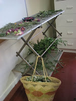 I took an old cloths drying rack that was actually broken and glued it back together. Unfortunately, this means it is no longer collapsible, but that is ok. By setting it up I am able to put a screen across the top as well as the bottom rods. Now I can lay herbs across these screens and they have plenty of airflow from above and below. I could also tie bundles of herbs to the rods. You can see I also have a grass woven bag hanging from the rack. The open weave of this bag allows airflow and I can have dry herbs inside of that as well.